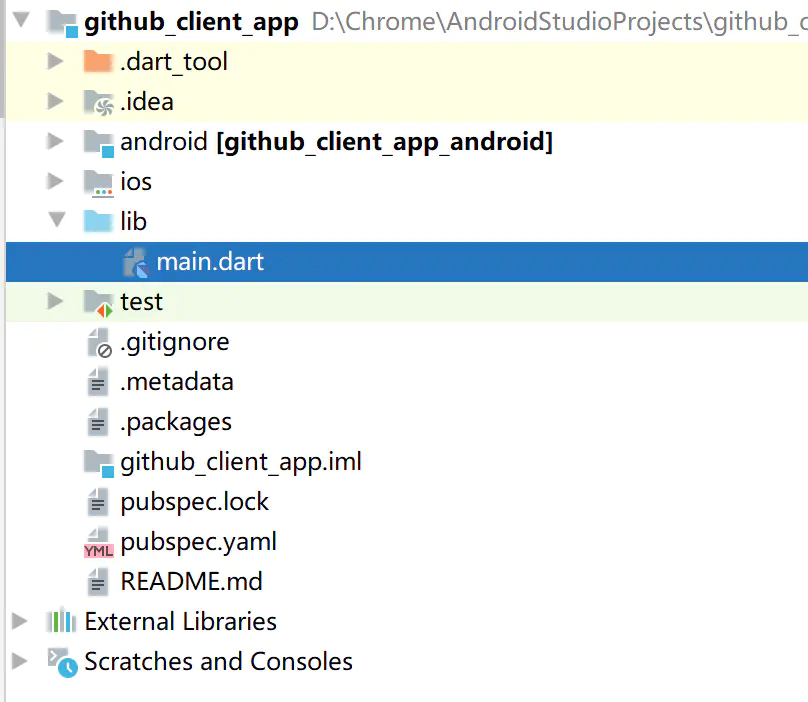 首先,使用Android Studio新建一个flutter工程,假设名为github_client_app;创建完成之后,工程结构如下: